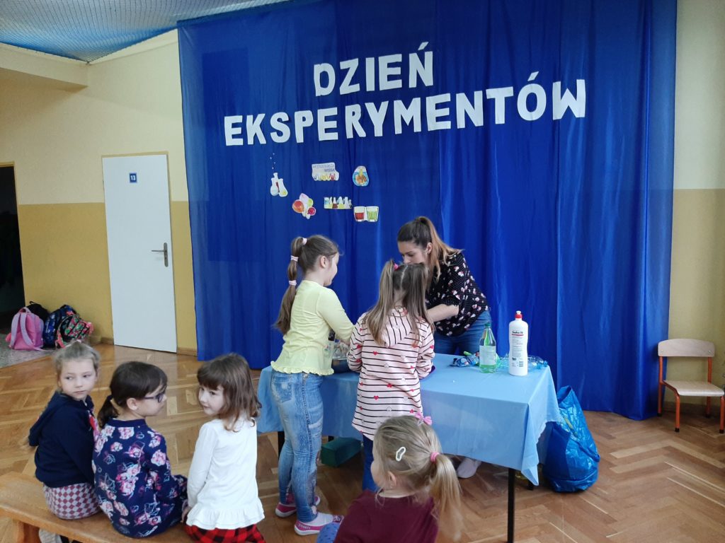 Najmłodsi uczniowie w sali gimnastycznej uczestniczyły w prezentacji niesamowitych eksperymentów: magiczne słoiki, gasnąca świeczka, wirujące balony, znikający atrament, magiczne baloniki, perełki w oleju, wybuchający wulkan, mleczna mozaika, cukierkowa tęcza.