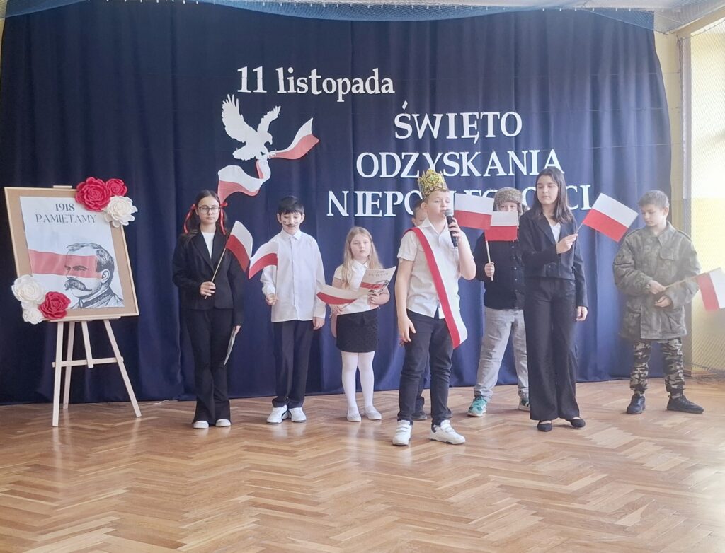 Następie uczniowie zaprezentowali inscenizację przypominającą trudną drogę Polaków do niepodległości. Piękne recytacje, pieśni patriotyczne i symbole narodowe wprowadziły wszystkich w podniosły, pełen refleksji nastrój.